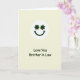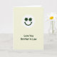 This card shows a calm, minimalist design on a creamy pale yellow background, with a soft white circle near the top center that looks gently lit. Inside the circle sits a simple smiling face, where the eyes are two dark emerald-green shamrock shapes that give the expression a sweet, lucky look ☘️. A matching deep green, wide curved smile sits below, making the face feel warmly welcoming, like a friendly glance shared across the room. Under the face, the line “Love You Brother in Law” is placed in the lower half of the card, centered and easy to read. The lettering is the same deep green as the shamrock eyes and smile, tying the message closely to the friendly face above 💚. With lots of open space around the elements, the layout feels uncluttered and gentle, like a quiet moment of family closeness. The dark green features and text stand out against the pale yellow field, with the glowing white circle framing the face at the top.