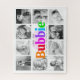 “Love you Bubbie.” She’s loving every minute with her grandkids. A playful, whimsical, stylish visual of multicolor rainbow bold typography and black handwritten typography overlay a soft, light pink heart and a white background. Add 10 cherished photos of your choice and customise the names and message, for the perfect modern, stylish, personalised photo collage jigsaw puzzle she’ll always treasure. Choose black and white photos for an elegant look. (ADDITIONAL PHOTO TIP: Pre-crop your photos into similar shapes and/or have the subjects in the middle BEFORE uploading.) Available in five different sizes. A great Jewish keepsake gift for your bubbie on Mother’s Day, Hanukkah, her birthday, or other holidays.