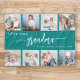 Give Grandma a gift she'll cherish. This photo collage blanket features eight of her favourite square photos of the grandkids, along with the message "Love You Grandma." The word "grandma" appears in elegant white handwriting script with flourishes at the beginning and end on a teal blue background. Add the names of up to four grandchildren. An ideal gift for holidays, birthdays or grandparents' day.