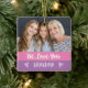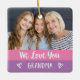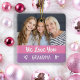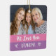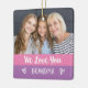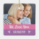 This trendy and stylish Christmas holiday ornament features two photos of you and your grandmother, with modern colour blocks in pink and lavender purple with white handwritten script typography and cute scribbled hearts. The ornament says "we love you grandma."