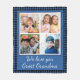 Personalized great grandma blanket with 4 photo template to add grandchildren pictures on a festive blue buffalo plaid background.