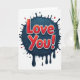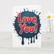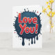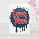 Designed with a big “Love You!” message in thick red letters right in the center, this card makes its point right away 💘. The letters look puffy and rounded, with a lighter red shine on top and a soft gray shadow that helps them stand out. Behind the words is a dark indigo splash shape on a white background, like a paint spill that spread out in one quick moment. The splash has lighter blue areas and tiny white star-like marks that add a dreamy, space-like feel. Around the main shape, small red drop shapes and scattered black dots shoot outward, giving the design lots of energy. A few dark drips run down from the splash, making it feel like the color is still moving. With its strong colors and sweet message, it’s a fun way to say how much you care ❤️😘. Hope it helps you share a little extra love on Valentine’s Day.