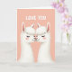 In this lovely card, we see two llamas sharing a sweet moment full of affection. The llamas are white, with rosy cheeks and pink accents on their ears and noses, set against a soft peach background. They mirror each other, their necks gracefully arched, eyes closed in peaceful contentment, and their snouts almost touching in a tender gesture. The artist used subtle shading to give depth to their fluffy coats, with delicate brushstrokes depicting the softness of their fur. Above them, in bold white letters, the words "LOVE YOU" stand out, adding a cheerful and direct message to the scene. This simple yet powerful message draws us into a world of gentle emotions and pure sweetness, evoking feelings of profound affection and joyful serenity. It's a heartwarming image perfect for sharing love on Valentine's Day. ❤️💌🍫