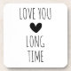 Cute and trendy typography coaster with the words 'love you long time' in a black text on a white background, and a small black heart in the middle.
