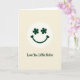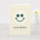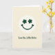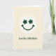 This card features a simple smiling face centered inside a cream-colored circle, set against a soft pale yellow background that feels like a gentle morning glow. The eyes are two four-petal clovers in deep forest green ☘️, giving the face a sweet, lucky look. A wide green smile curves upward and ends in two small heart shapes, like a quiet hug tucked into the design. The circle sits in the middle of the front, with plenty of open space around it so the face feels calm and easy to notice. Beneath the circle, the words “Love You Little Sister” appear in dark green, placed low and centered, with a flowing handwritten look that reads like a note passed between close friends or sisters 💚. The limited colors—pale yellow, cream, and forest green—keep everything soft and cozy, while the clover eyes and heart-tipped smile add a tender, affectionate tone. The green text sits just below the circle, and the heart shapes cap the ends of the curved smile inside the cream ring.