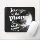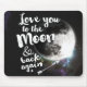 A spacey design featuring the phrase "Love you to the Moon and back again" in white. Dark space background with stars, dust, and the moon.