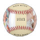 Personalised baseball with two photos and baseball quote. The wording reads "love you to the outfield and back" and is lettered in hatched print and typewriter text. The photo template is set up ready for you to add your pictures and the year. The design has a colour palette of cream, black and gold. A personalised baseball is a great gift for father's day, birthdays and keepsakes.