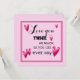 A sweet card for your Valentine, an anniversary or birthday for a loved one. Pale pink background with black lettering. Sentiment reads "Love you twice as much as you can ever say". Watercolor painted hearts are scattered about. There is a place for you to personalise the card with your own message on the back. Let your loved one know that no matter how much they tell you they love you, you'll always love them twice as much.