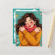 A cute whimsical folk art style postcard to keep in touch with a friend or family member with a girl in a warm cosy sweater giving herself a hug. Remember yourself that self-love is important with this pretty ai illustration.
