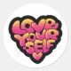Bold and playful “Love Yourself” typography design in a cute bubble letter style with vibrant pink to orange gradient. Shaped like a heart, this artwork spreads a positive self-love message with a trendy, fun aesthetic. Perfect for stickers, phone cases, apparel, and gifts that inspire confidence and good vibes.