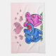 Pink hearts float above a pink and blue elephant who love each other