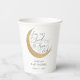 Loved to the Moon and Back baby shower paper cups. Design features faux sparkly gold moon with "You are loved to the moon and back" in a cute calligraphy text. Personalise with your information or click "Click to customise further" to edit font styles, size and colours.