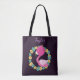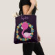 A lovely flamingo designed tote bag, this item features a deep purple background with a colourful blue and yellow floral wreath. A pink flamingo is inside of the tote. Your name can be personalised at the top. Order yours today!
