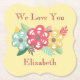 A lovely floral paper coaster on a light yellow background, this flower display is blue, pink and yellow. At the top is "I love you" with a personalised name at the bottom all in lovely burgundy font. The easy to use templates makes it possible to customise the text to say anything you wish. Place your order for these floral coasters today!