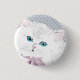 cute white cat with blue eyes and a pink bow. Pink dots on background