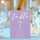 This lovely lilac wedding table number features beautiful white typography of the guest's names on a soft purple background for a spring ceremony in the afternoon. Lavender pastel decor is a delicate colour choice for an elegant garden occasion.