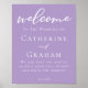 This lovely lilac wedding welcome poster features beautiful white typography on a soft purple print for a spring ceremony in the afternoon. Lavender pastel decor is a delicate colour choice for an elegant garden occasion.