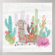 A soft, watercolor with a llama lounging among cacti. Artist: Mary Urban