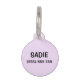 This pet tag has a lovely illustration of a purple butterfly on a lilac background colour. On the other side there are customisable text areas for the name of the pet and for a phone number.