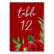 Help your guests find their seats with this elegant red, floral table card. The letters and numbers are in a script font, while a red floral arrangement sits below the text.