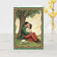 This St. Patrick's Day card shows a couple sharing a gentle kiss on deep green grass beneath a wide, mature tree, with an ornate art nouveau border wrapping the scene. Earthy greens and warm browns shape the frame, and small shamrock motifs tucked into the corners add a quiet ☘️ touch. The man wears a forest-green jacket with rust-toned trousers, leaning in with an easy, protective hold that reads like steady devotion. Beside him, the woman in a cream blouse and flowing terracotta skirt tilts toward him, her relaxed posture and closed eyes suggesting calm trust and closeness 💚. Above the illustration, St. Patrick’s Day text sits near the top in a soft green, centered so it feels like it’s floating over the treetop canopy. The sky behind them is brushed with pale, impressionistic clouds, and the light looks diffused like a mild afternoon. Near their feet, a straw hat and a walking cane rest on the grass while the tree’s textured bark rises behind them, dark and ridged against the softer greens. Share St. Patrick's Day sentiments with someone you care about, and let the border’s curling lines and shamrock details lead the eye back to the couple under the spreading branches.
