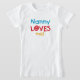 Nanny Loves Me T-shirts, cards, stickers, bodysuits bags, and more with colourful red, yellow, and blue text and heart design. These Nanny Loves me apparel and gift items will make nanny smile!