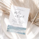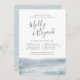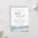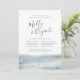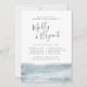 Our elegant summer wedding rehearsal dinner invitations feature classic nautical styling with a clean, minimalist look. Design features a watercolor wash along the bottom in pale grey blue, with your ceremony rehearsal and dinner details in a chic combo of block, italic and hand lettered script typography. Perfect for nautical or summer rehearsal dinners. Invitations reverse to hand drawn wavy stripes in tone on tone icy blue-green.