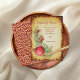 Personalise the text of this card to include your own special message and a salutation with your name. The card features watercolor painted pomegranate, flowers and a leafy branch on a background of burnt paper. The back of the card contains an elegant damask pattern in hues of gold on deep red.