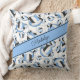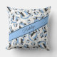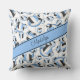 This cute volleyball team colours throw pillow for girls features a pattern of varied size stylised light blue, black and white volleyballs turned every which way overlying a volleyball net detail graphic - the volleyballs' blue and black panels are blended with an artsy, girly floral pattern - personalise her name in a sophisticated handwritten font on a bold, angled, full width blue colour strip - background and name strip colours are customisable - by katz_d_zynes