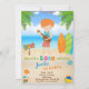 Cute invitation Hawaiian style for boy's birthday featuring redhead boy with guitar, surfs, beach and blue ocean, and some tropical party equipment.
