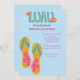 Start your celebration off right with this adorable Luau invitation. Whether it's a backyard barbecue or a kids birthday party this is the perfect invite for you! It has a a light blue background with orange flip flops on the left side of the invite. They have hot pink flower shapes on them. Across the top of the invitation is the word "Luau" with a red and orange hibiscus flower on each end of the word. Check out the many other designs and products in this line. ©JW Illustrations