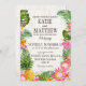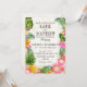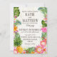 Rustic beach luau theme with tropical floral featuring plumeria, hibiscus, and pineapple wedding invitation card.