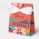 This tropical aloha summer pool birthday party favours features tropical leaves, tropical flowers in a bright and bold orange background.A Perfect luau tropical aloha summer pool birthday theme birthday favours.