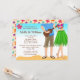 Invite the guests for a beach or luau wedding shower in style with this modern and fun beach wedding invitation. Features bride wearing a grass skirt, a lei and flips flops and her groom playing the ukulele in the sand.