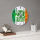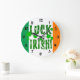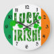 Festive green orange and white clock with starry font and seven green lucky shamrocks or four-leaf clovers. These are the true colours of the Irish flag. Green is for the Gaelic tradition; orange is for the followers of William the Orange; white stands for peace between them. Three and four-leafed clover is found world-wide and has been associated with nature magic, springtime, good health and prosperity since pre-Christian times. Four-leaf shamrocks or lucky clovers are particularly abundant in Ireland as they often occur in fields of white clover - hence the saying "Luck o' the Irish!". This is also a great clock for an Irish pub, community centre, sports team or Irish theme party. Cheers!