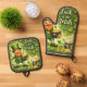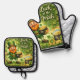 Add festive function to your kitchen with this cheerful Luck of the Irish pot holder set, part of the Brownmaiden Holiday Collections. This matching set includes one oven mitt and one square pot holder, both featuring a playful leprechaun surrounded by shamrocks, gold coins, and rich green accents.