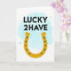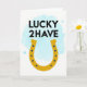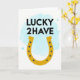 This card features a golden horseshoe centred on a white background, its warm yellow tone giving the scene a friendly, welcoming glow 💚. Above it, the words “LUCKY 2HAVE” are stacked in black, all-caps lettering, sitting neatly over the horseshoe like a confident headline. A soft cerulean-blue wash floats behind the top text and the horseshoe’s upper curve, like a light cloud drifting across a calm sky. Small dark-blue dots run along the horseshoe as tidy rivet marks, adding a grounded detail that balances the sunny gold. Fainter, translucent blue circles scatter around the blue wash, like bubbles rising and drifting, which makes the space feel airy and close. The simple layout leaves plenty of white space, letting the horseshoe and message feel like they’re meant for someone you’re lucky to have close ☘️. The blue accents stay mostly around the top half, with the horseshoe’s dark-blue rivet dots evenly spaced along both sides.