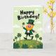 This greeting card shows a cheerful leprechaun in a cartoon style, standing on a rolling green hill with a friendly, welcoming stance that feels like he’s greeting someone close 💚. He wears an emerald coat and a tall hat with a buckle, paired with yellow-and-green striped socks and shiny black shoes. His bright orange beard frames rosy cheeks and wide eyes, and his open grin gives him the look of a pal leaning in for a laugh. In one hand he lifts a three-leaf clover ☘️, while the other arm stretches outward as if inviting a hug or a high-five. Above him, the words “Happy Birthday!” sit near the top in rounded black lettering that stands out against the pale green sky. The background fades from light to slightly deeper green with soft white clouds drifting behind the text. Along the bottom, small shamrocks and little yellow flowers dot the hillside in front of the leprechaun.