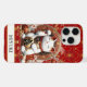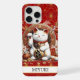 Make a statement with this iphone 15 pro max phone case that features a Lucky Cat with gold coins and flowers around it on a red and gold background. It's modern yet traditional Japanese Maneki-neko is designed to attract good fortune, prosperity and customers into your business. The right paw raised brings money and wealth and the white cat symbolizes general happiness. It becomes uniquely yours with your name in a CAP font in black. Invite luck and prosperity into your life!