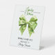 Lucky charm sage green bow with green clover St. Patrick's Day Irish baby girls shower Welcome sign . An elegant sage green coquette bow, decorated with bright green clovers, adds a touch of Irish whimsy to this "WELCOME" sign. It also includes the text "A little Lucky Charm is on the way," using shamrocks to replace two letters and set a joyful mood.