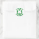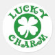 Green and white circle emblem with lucky charm in circular round text.  Four leaf clover shamrock for the luck of the irish!  Copyright © www.CuteComfy.com