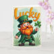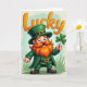 This card features a happy leprechaun standing front and center, smiling as if he’s sharing a friendly secret with you 💚. His bright orange beard and mustache frame his grin, and his green eyes catch the light in a way that feels warmly inviting. He wears a deep emerald suit with a tall green hat, each finished with a shiny gold buckle, plus a black belt and sturdy brown boots. Held forward in his hand is a neat four-leaf clover ☘️, offered like a small, sweet token between friends. Behind him, the background fades softly from pale mint green into creamy beige, giving the scene a gentle, airy setting. Across the top, the word “Lucky” curves overhead in chunky, 3D-style orange lettering that stands out against the light backdrop. Near the bottom edge, a few simple blades of grass sit at the base while tiny light specks float near the upper background.