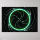 Bright streaking threads of light flow and curve around and into a circular shape, all glowing brilliant green, in this original fractal design! Great gift idea!