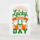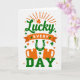 Made to share a festive St. Patrick’s Day scene in emerald green and warm orange, set on a white background with soft, subtle stripes. At the top, the word “Lucky” appears in flowing green lettering, with orange rays and a small shamrock beside it, like a cheerful wink between friends 💚. Near the middle, “EVERY” sits on a curved orange banner, trimmed with tiny green shamrocks that feel like little confetti. Below that, “DAY” is written in sturdy green letters, giving the layout a grounded finish. Under the text, a green horseshoe with dotted details sits between two orange beer mugs, angled toward each other as if clinking in a friendly toast ☘️. White foam spills over the tops, adding a cozy, just-poured look that makes the moment feel shared. Small green shamrocks and star shapes are scattered around the mugs and horseshoe, filling the lower area with extra lucky details. Share St. Patrick’s Day sentiments with someone special, and notice the orange starbursts and tiny shamrocks sprinkled around the lettering and icons.