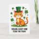 This card shows a friendly ginger cat in warm orange tones, with soft stripes and a tiny pink nose, sitting on a bright green patch of grass 💚. The cat wears an emerald leprechaun hat with a shiny gold buckle, tilted just enough to feel like it’s dressed up for someone special. Its eyes are closed in a calm, pleased smile, and the whiskers fan outward as if it’s soaking in a sweet moment. Around the cat, four-leaf clovers float in different sizes, adding little sparks of green that make the scene feel like a shared celebration ☘️. The background stays white and open, keeping the focus on the cat and the clovers circling it. Centered below the illustration, the phrase “FEELING LUCKY AND FELINE FINE TODAY” appears in black, all-cap letters, set on a single line that anchors the picture. The hat’s deep green contrasts with the cat’s orange fur, while the scattered clovers frame the character like a loose, leafy halo.