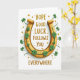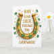 This card features an upward-facing golden horseshoe that gleams like polished metal against a bright white background, with emerald shamrocks curling around its inner curve for a close, affectionate feel 💚. The clovers are shaded with soft shadows, and their stems seem to tuck in and overlap as if they’re gently holding on to the horseshoe. A thin green patterned trim runs along the inside edge, tying the leaves to the gold shape like a neat little ribbon of detail. Centered inside the horseshoe, the message “HOPE GOOD LUCK FOLLOWS YOU EVERYWHERE” appears in textured gold lettering that looks lightly dusted with glitter. The words sit stacked in the middle, filling the open space while leaving a small margin of white around them. Around the horseshoe, small gold stars and tiny glowing dots scatter like confetti, adding a celebratory sparkle ☘️. The final look shows crisp highlights on the horseshoe’s curves, velvety green leaf surfaces, and a few stars drifting near the top-right edge.