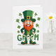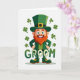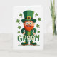 Designed with a cheerful cartoon leprechaun standing in the center on a bright white background, this St. Patrick’s Day card keeps the focus on one friendly character. He wears a tall emerald hat with a gold buckle, along with a matching green jacket, vest, and trousers that look neatly fitted. His ginger beard spills down under a wide grin, and his aqua eyes feel like they’re aimed right at someone he’s happy to see, like a close friend or a sweetheart 💚. Small green shamrocks are scattered around him like confetti, giving the empty white space a light, lucky rhythm ☘️. A soft gray shadow sits under his buckled shoes to anchor him on the page. Along the bottom front, the word “GROOM” appears in large gradient-green letters that overlap the foreground. The hat buckle and shoe buckles shine in gold, and the shamrocks float around the figure against the white backdrop.