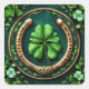 Vibrant illustration depicting a golden horseshoe paired with a lush four-leaf clover and decorative green vines symbolising luck, prosperity, and nature.