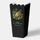 Favour box with a St. Patrick's Day themed image. A black and gold horseshoe sitting in a bed of green clover with shiny gold coins.