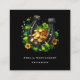 Business cards with a St. Patrick's Day themed image. A black and gold horseshoe sitting in a bed of green clover with shiny gold coins.